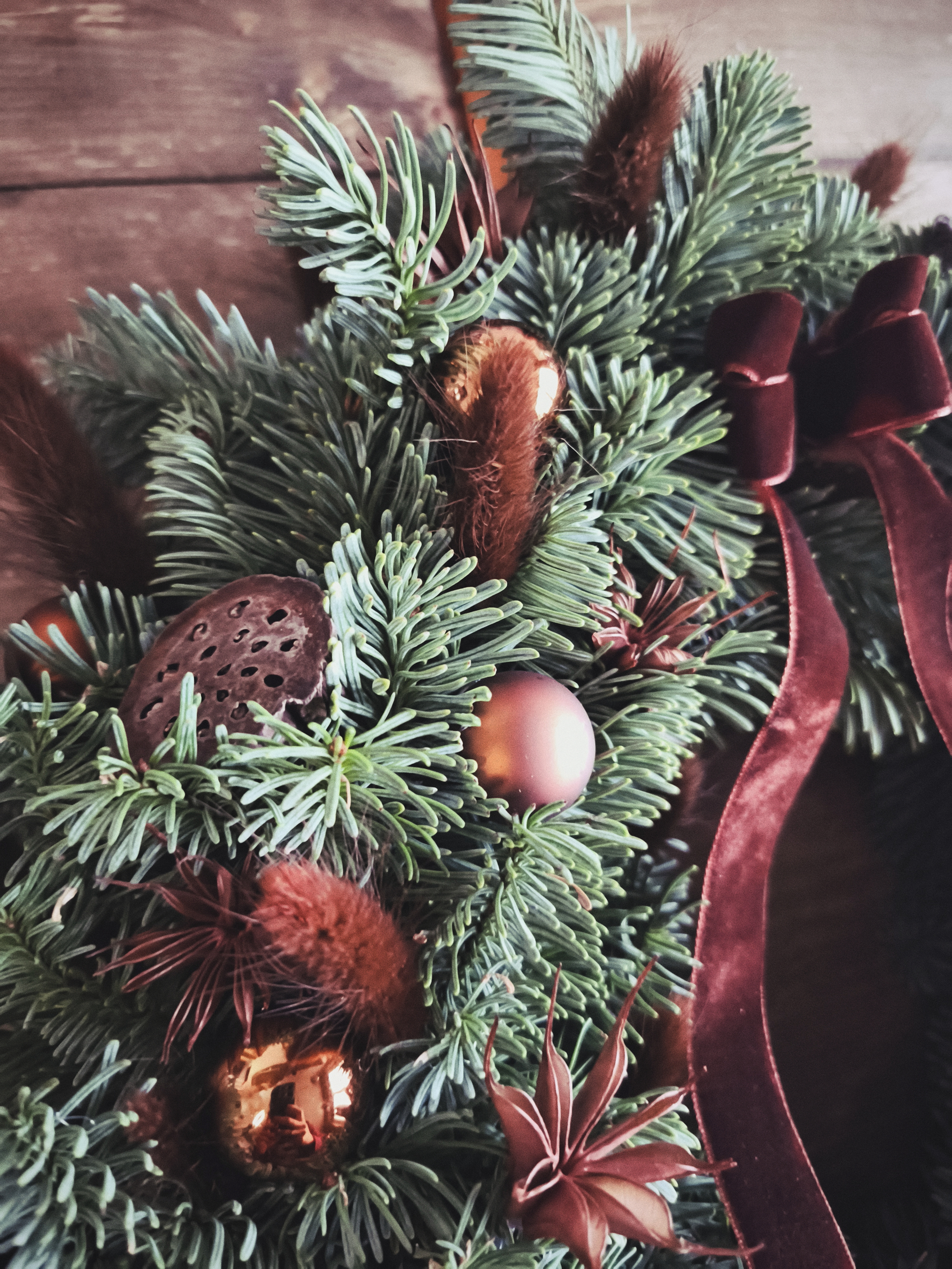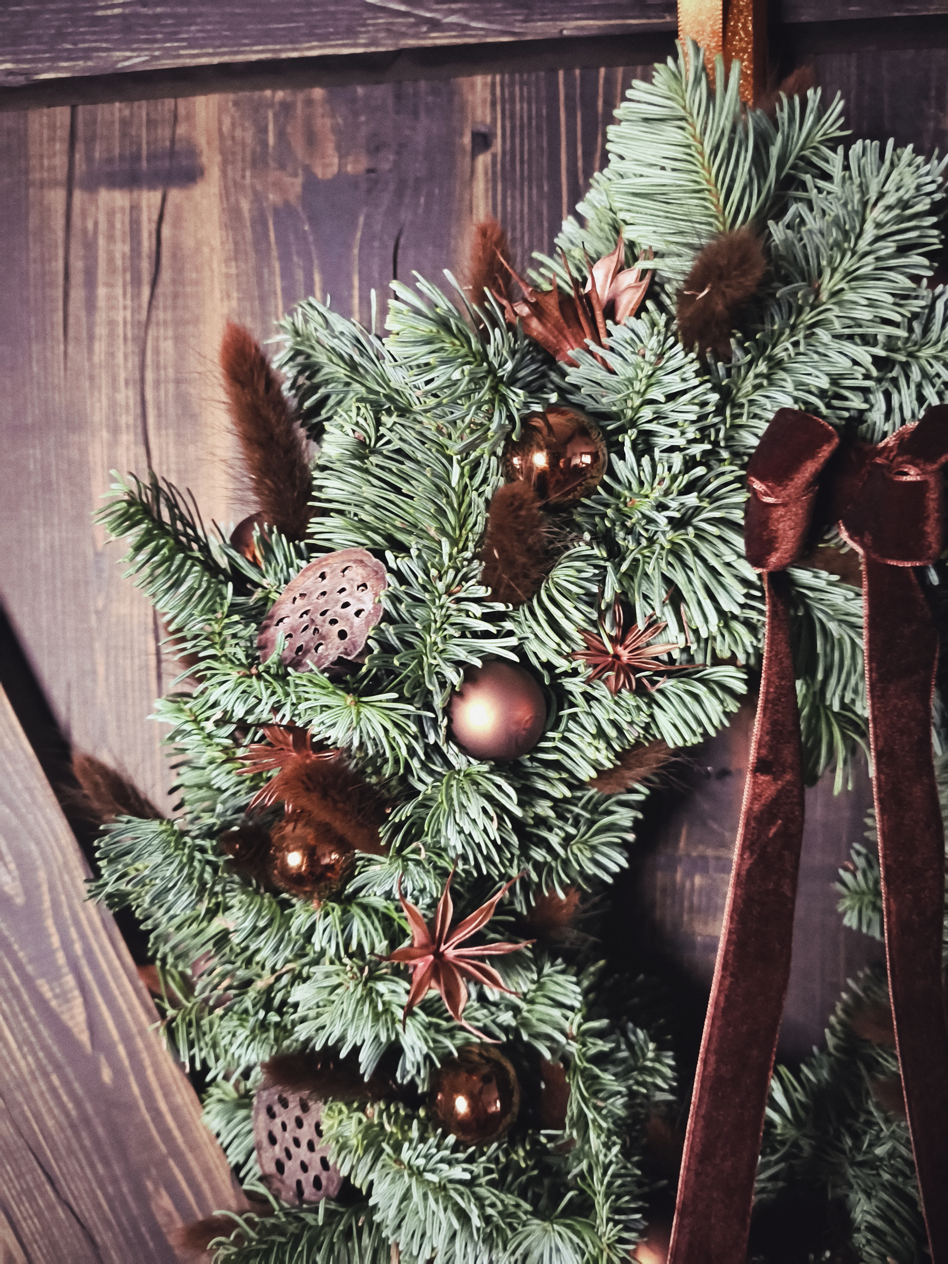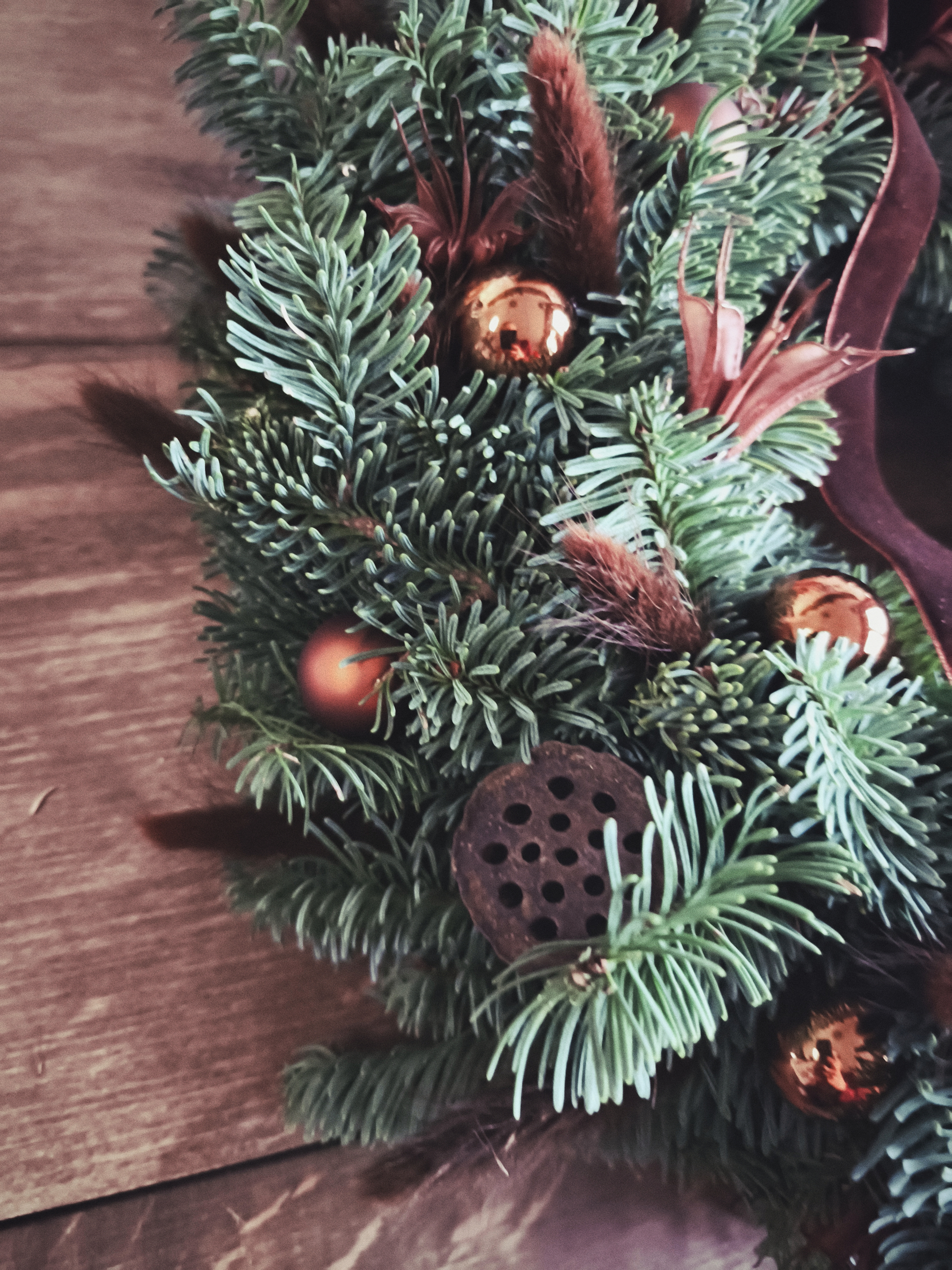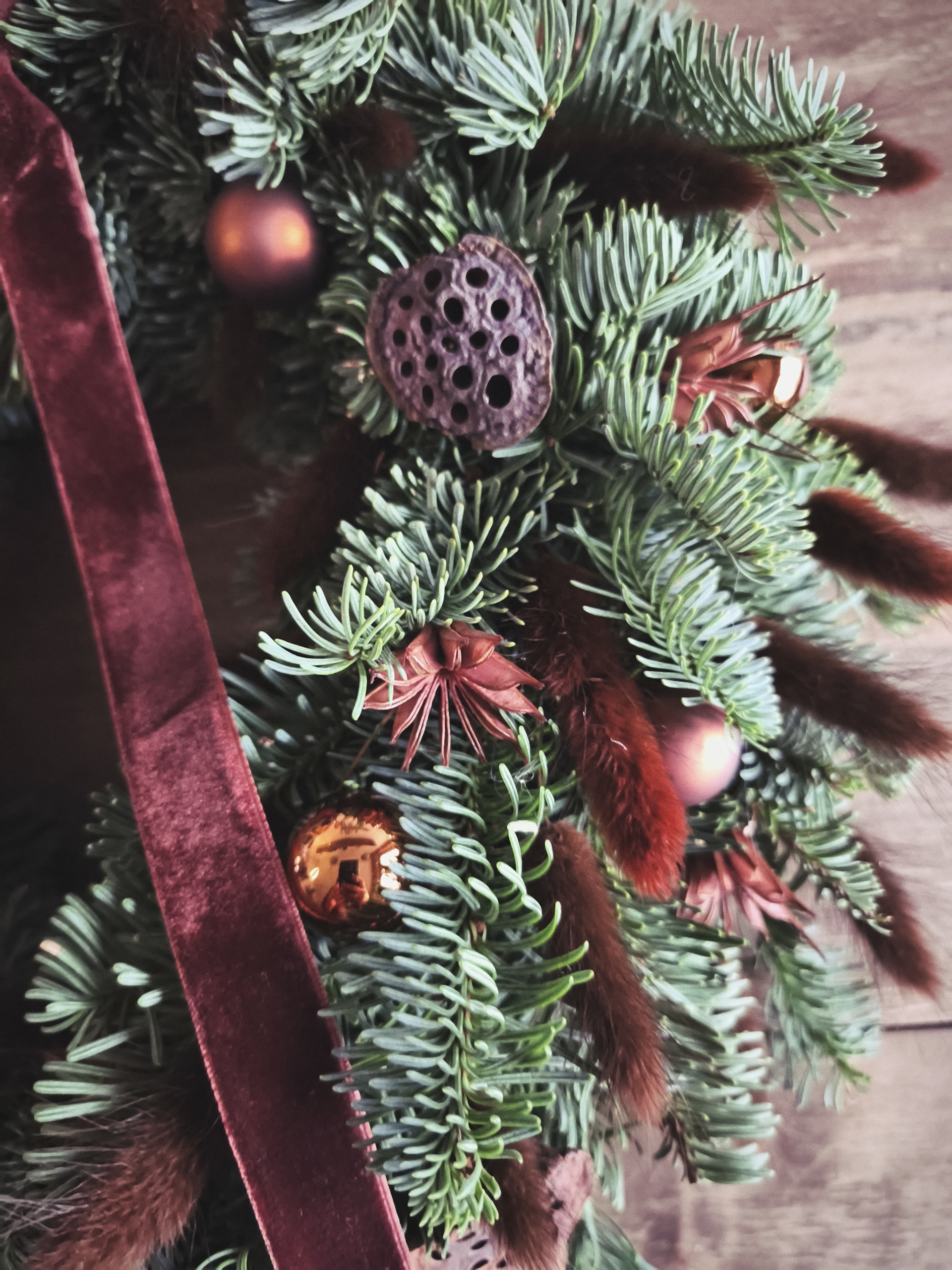 Naturalne dodatki w odcieniach brązu dodają wiankowi głębi i rustykalnego uroku. W kompozycji znajdują się suszone: dmuszek, czarnuszka oraz lotus, które podkreślają organiczny charakter dekoracji i pięknie kontrastują z zielenią igliwia.