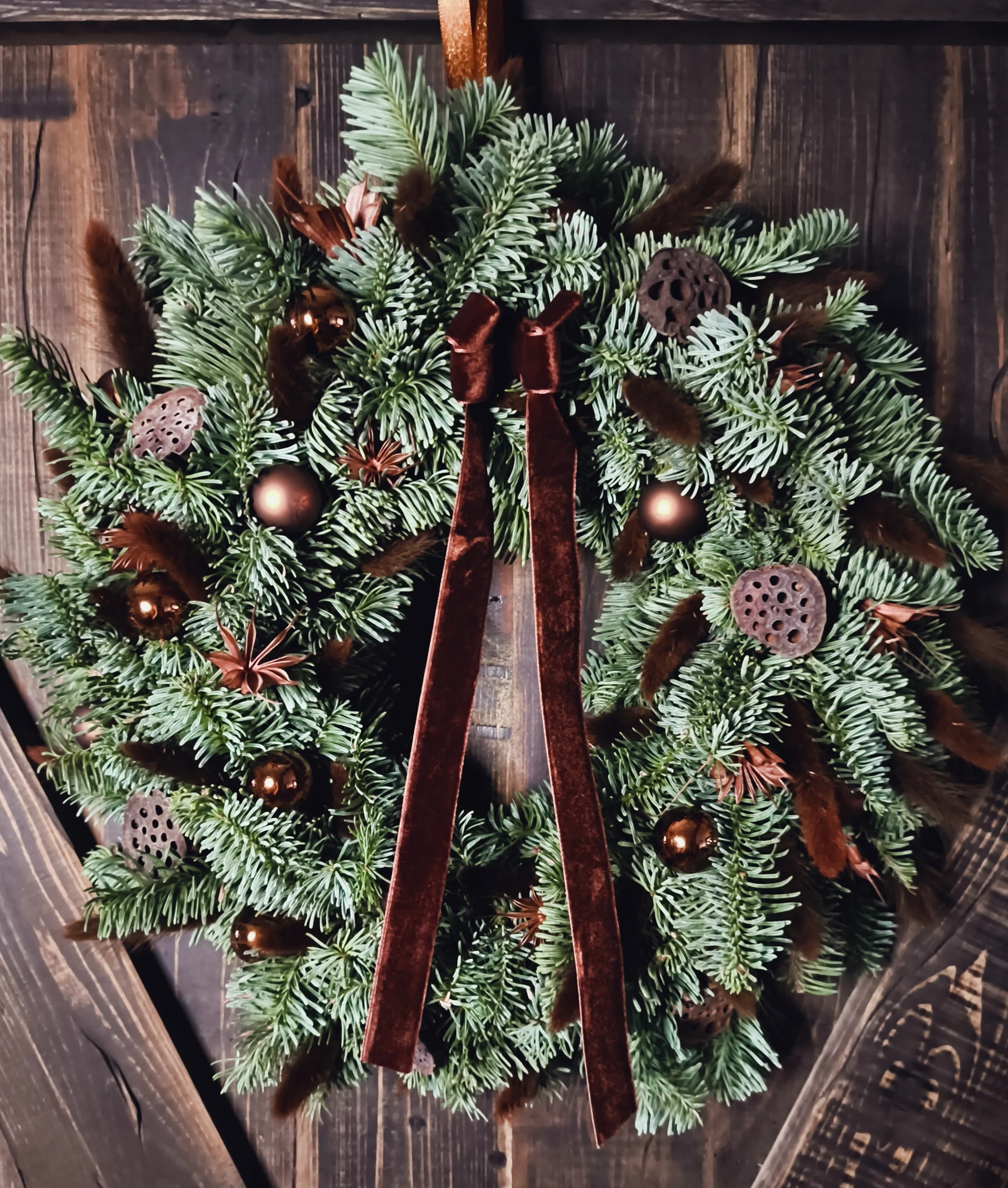Wyjątkowy, świąteczny wianek wykonany z żywej jodły nobilis – znanej ze swojej trwałości, intensywnego koloru i delikatnego, leśnego zapachu. Osadzony na słomianej obręczy, tworzy lekką, elegancką formę, idealną do powieszenia na drzwiach, ścianie lub jako dekoracja nad kominkiem.