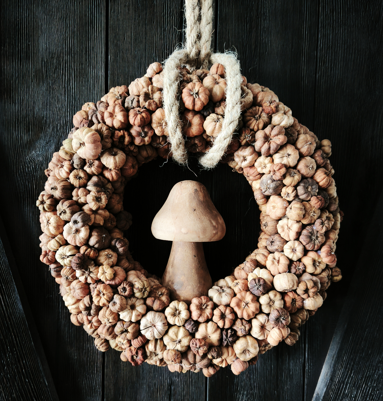 Wianek w rustykalnym stylu – przenosi prosto na wiejskie podwórze pełne jesiennych skarbów. Naturalne mini dynie w ciepłych barwach i uroczy drewniany grzybek tworzą kompozycje, która emanuje prostotą i sielskością.
