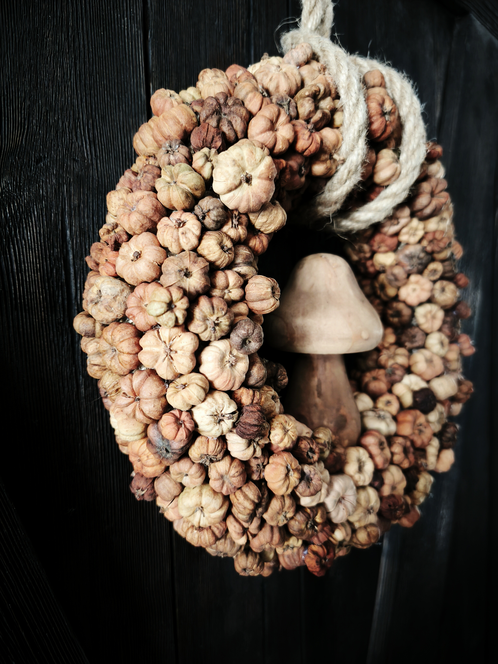 Wianek ręcznie wykonany metodą wklejania na słomianej obręczy z naturalnego suszu (mini dyń) oraz drewnianego grzybka.
