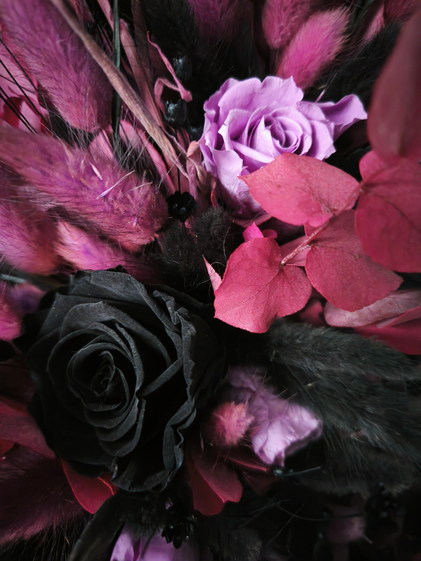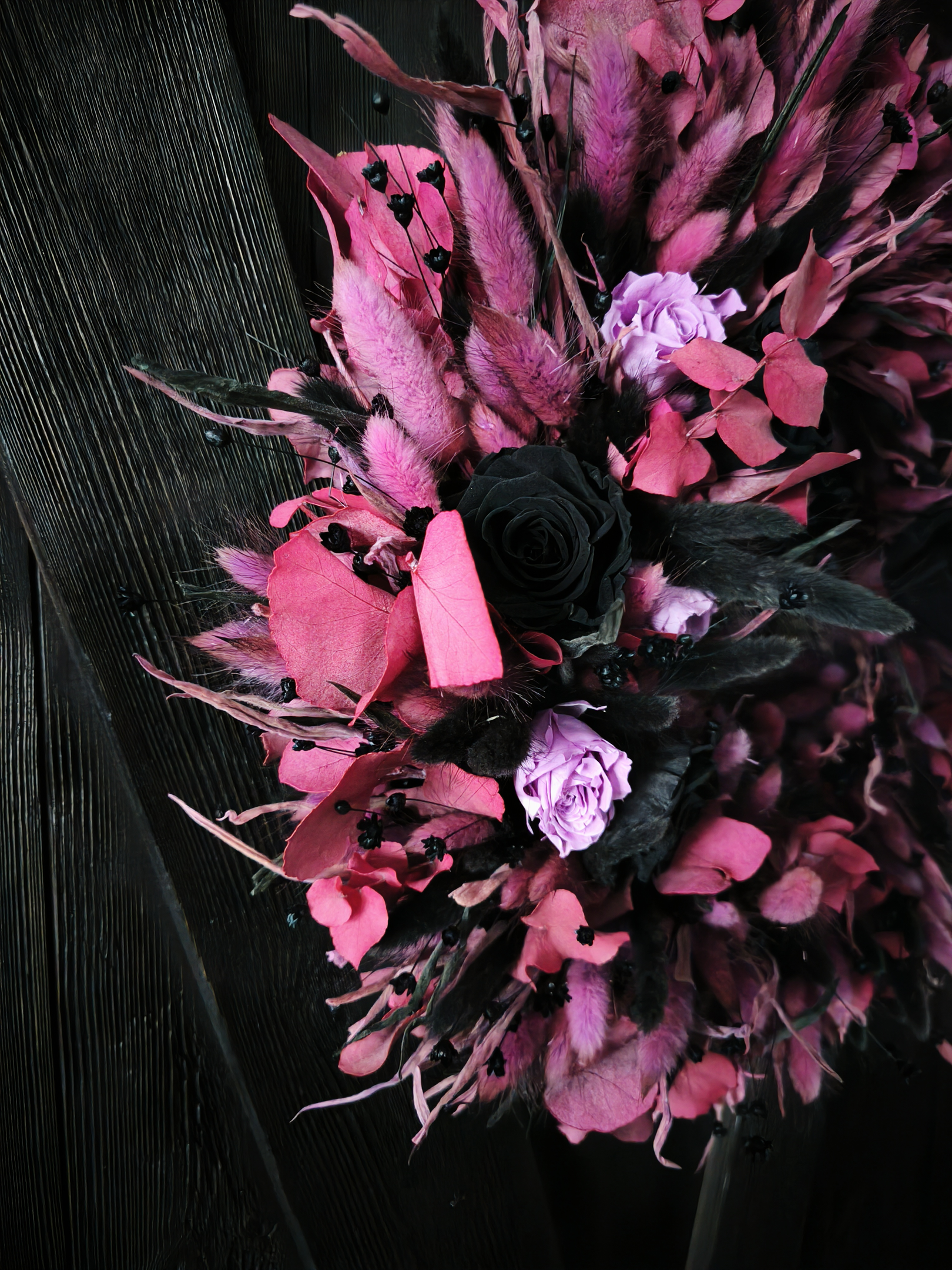 stabilizowany różowy eukaliptus, suszony dmuszek w odcieniach purpury i czerni, czarna gliksja, czarne i liliowe stabilizowane róże