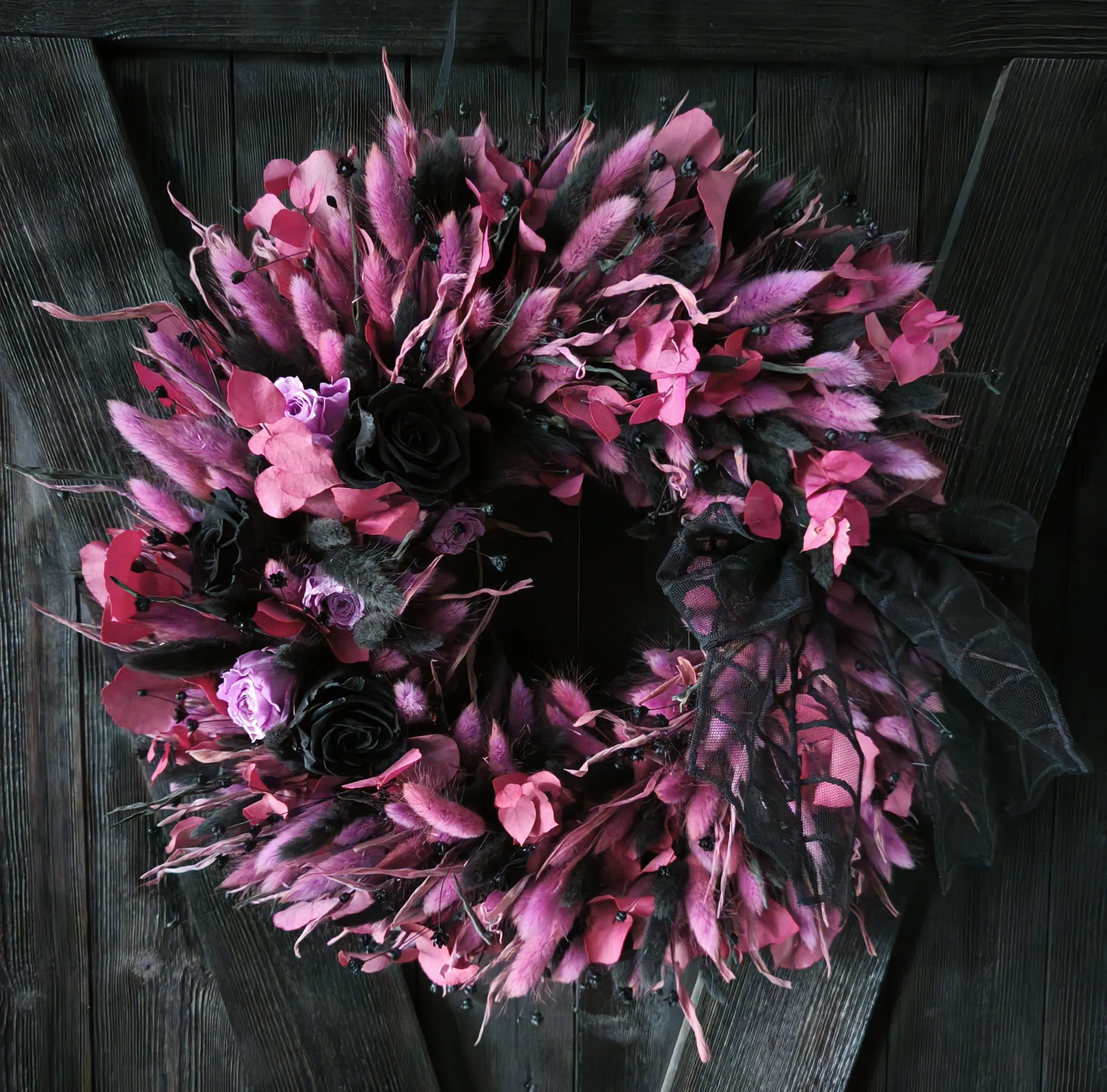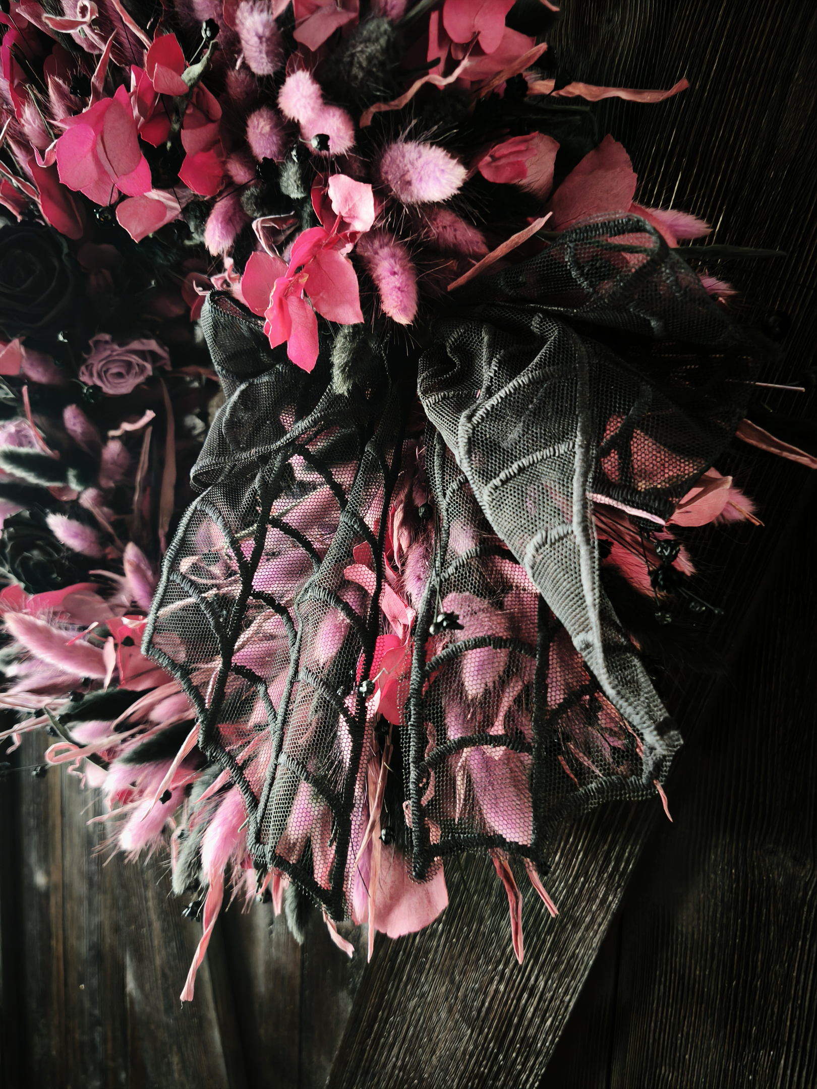 Ten ręcznie wykonany wianek botaniczny to naturalne połączenie mroku i delikatności — kompozycja, która zachwyca kontrastami i subtelną magią. Udekorowany stabilizowanymi różami i przewiązany tiulową wstążką z motywem pajęczyny, przywołuje atmosferę romantycznej tajemnicy i czarownego półmroku.